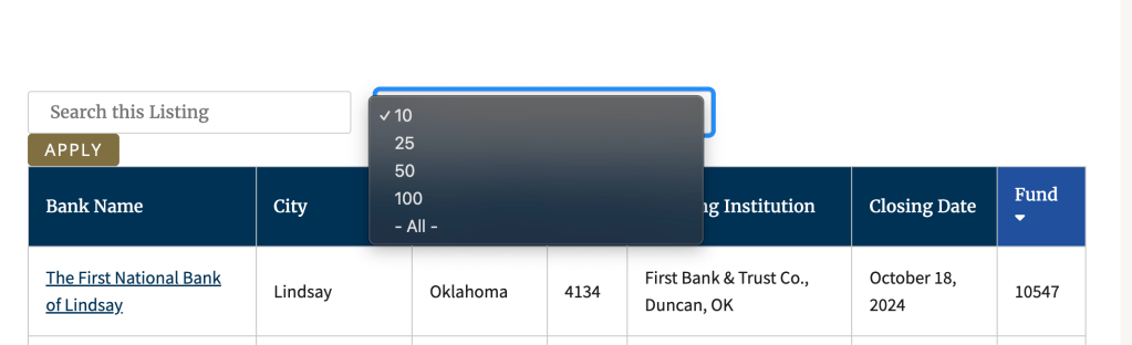 If you don’t do this step, you’ll get only the first 10 failed banks from the first page. Once you’ve hit the apply button, the new link will look like this: https://www.fdic.gov/bank-failures/failed-bank-list?combine=&items_per_page=All